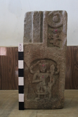 | Description / विवरण | This is a broken part of a doorjamb. Intricate floral motifs have been carved on the member in a vertical alignment along with a vidyadhara. At the lower part, there is a four-handed unknown figure that is adorned with mutuka and kundala. The figure appears to be holding a sword and a trisula. However, the rest of the details are unclear. |