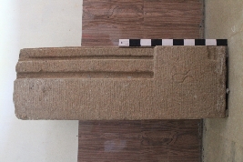 | Description / विवरण | This is a doorjamb fragment with simple vertical line carvings. A petroglyph engraving is visible on the lower portion while a socket and a clamp mark can be seen on the upper face. |