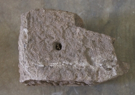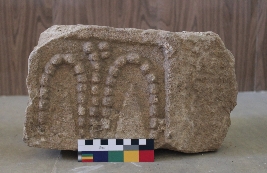 | Description / विवरण | This decorative block has a beaded floral design that forms an arch shape. In the middle, there is a vertical beaded design, while triangles can be seen between the arch design. The same design is repeated on the adjacent face. On the top face of the block, there is a socket. |