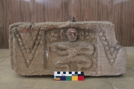 | Description / विवरण | This is a stone block that features a figure at the centre.The figure is adorned with a beaded necklace and on either side of the figure, there are v-shaped beaded designs that have been intricately carved. The image suggests that there was a tribal influence during that period. However, other details in the image remain unclear. |
