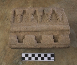 | Description / विवरण | This is a temple architectural fragment featuring geometrical motifs with a horizontal line in the middle. The lower portion displays a step-like block design. |