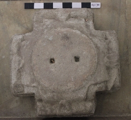 | Description / विवरण | This is a fragment of a pillar base with a circular top and a four-sided extension featuring a step-like structure. The circular top contains two square sockets, while the rest of the details are unclear. |
