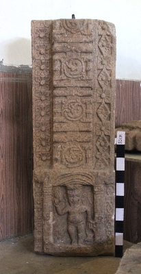 | Description / विवरण | This is a section of a door lintel that features intricate carvings of floral and geometric motifs. In the center, there is a vertical floral creeper design. Towards the bottom, there is an image of a sage (Rishi) with a long beard, elongated ears, and wearing a lower garment. The figure is holding a kamandalu in the lower left hand and an unidentified object in the upper hand, but the rest of the details are not clear. |