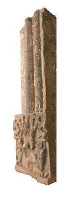 | Description / विवरण | Vertical pillar of the door jamb of pancha sakha variety with standing dwarapalaka at the foot flanked by female attendants. There is fluting and floral design above the sakha part. |