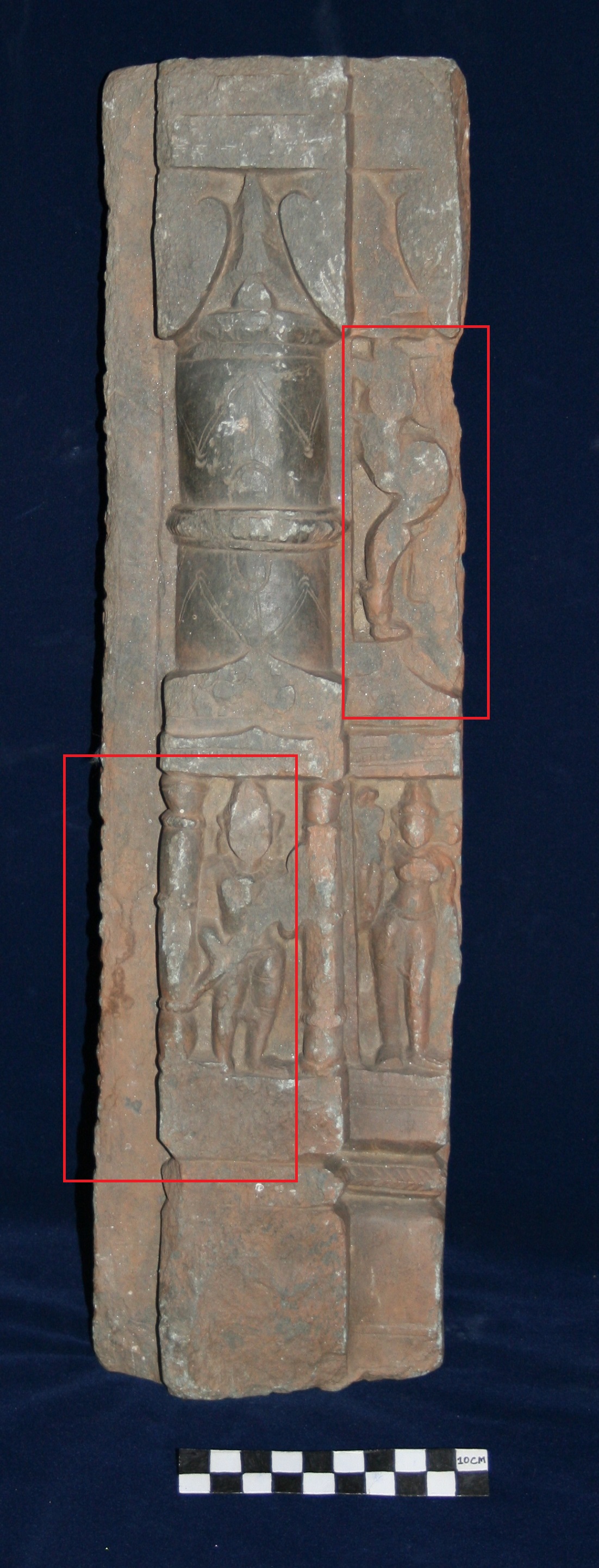Fragment of Door Jamb dwar shakha, depicting same as Antiquity No. 125. Yet being similar pattern there is huge difference in quality of engraving. Fragment of door Jamb dwar shakha depicting male and female figurine in the lower portion in tribhanga posture, over the female figurine depicting Singhavayala, Both are highly adorned with various ornamentation. The female is depicted with four hand. And the male deity is shown with two hands holding a ankush. A beautifully decorated pilaster is also depicted above the male deity.