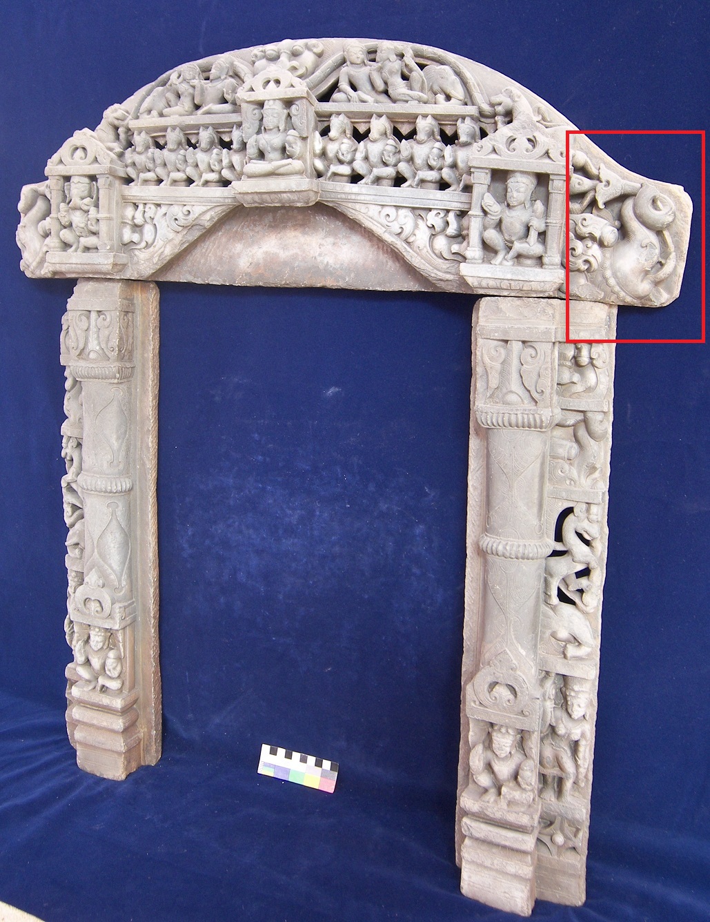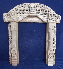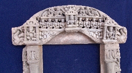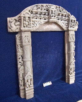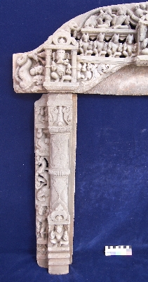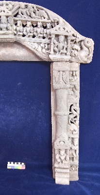 Present work of art is in three part two pilasters and a lentil. At bottom of both sides door jamb vaman is depicted sitting. A female attendant is shown above her a head of elephant and above that an animal with horse body ad tiger head is depicted on the side bar of both jambs. The lintels also have thee parallel lines of depiction. The lowest is just botanical depiction and on the edges Ganesha on right and Kartikay on left are depicted. Above that asthvama along with a female deity in center are shown. Above that in center kirimukha is shown and on both sides a couple of celestials and elephant is depicted respectively.