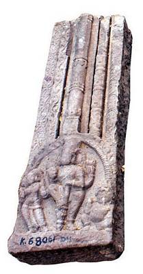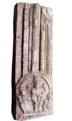 | Description / विवरण | Vertical pillar of door jamb of pancha sakha variety with standing dwarapalakaat the base holding a mace, flanked by attendants. It is decorated with flutings and foliage designs. |
