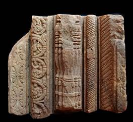 | Description / विवरण | This fragment is part of a door jamb of pancha shakha order depicting geomatrical and floral designs.The first shakha from the left is composed of diamonds arranged vertically and the intervening space is filled with petals.The second moulding depicts a row of creepers arranged in circles enclosing pot bellied dwarf figures shown holding flower buds.The third shakha is composed of pilaster motif having series of vertical and horizontal mouldings.The fourth one depicts twisted bead ropes and the fifth shakha is composed of lotus petals interspersed with row of beaded design. Such elaborate door jambs were prevalent during the late-chalukyan period. |