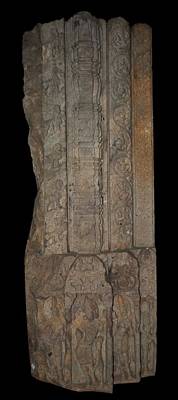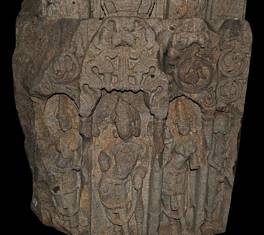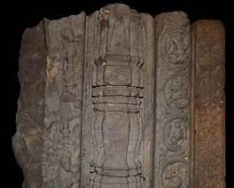 | Description / विवरण | In this relief a door jamb having five vertical sections or shakas are depicted. Of these five shakhas the one to the extreme left is obliterated.The remaining four sections comprise row of animals which includes lion,tiger, winged horse with their tales rounded up,pilsters,scorlls with relief dwarf musicians within circles and row of full blown flowers.The base part of the door jamb is sculptured with the relief of a vaishnava dvarapala couple flanked by two female chauri whisker bearers shown standing next to the couple respectively and each shown within a pilasterd torana. All are shown standing in tribhanga.The male figure of dvarapala rests his left hand on the hilt of gada or mace where as the right hand is in abhaya posture.He wears kirita makuta and bejewelled with ornaments. The female counterpart standing to his left wears a crown and bedecked with ornaments, holds citron in the left hand and carries a lotus flower in her right hand.The chauri bearer to right is devoid of right hand due to damage where as in left hand she holds phala. Similarly the one standing to left holds chauri in the right hand. Both the attendants are decorated with crown and ornaments .All figures are shown with heavy lower garment held by decorated girdle.The makara torana above the figures depicts scrolls,birds terminating at the apex with kirtimukha relief.on stylistic grounds this relief may be ascribed to late-chalukyan period. |