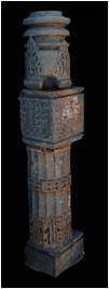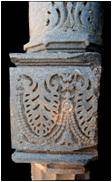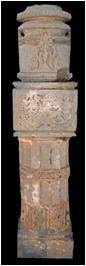 | Description / विवरण | This pilaster has four setions from bottom above. The square base measuring 15 cm in height is plain.The cylindrical section above measuring 72 cm in height, decorated with eleven flutings, is held by a octogonal decorated band depicting diamond shaped flowers and a series of floral reliefs at the base. The next square section measuring 26 cm in height is decorated with foliage encircled by two rows of beaded garland emanating from the mouth of a kirtimukha.The circular inverted bell shaped section at the top measures 33cm in height with two mouldings and decorated with foliage. |