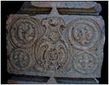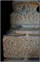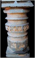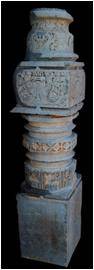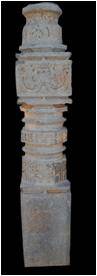 | Description / विवरण | This pillar has four setions from bottom above. The rectangular base, measuring 55 cm in height, is plain .The circular shaft above measures 56 cm in height and 33 cm in width.It is decorated with a series of floral reliefs at the base and above it are two circular and one octogonal mouldings.At the middle part a wide octogonal decorated band depicting diamond shaped flowers adorns the shaft.The next square section measuring 22 cm in height is decorated with foliage emanating from kirtimukha on one face. In another frame, foliage motif at the centre is surrounded with circles depicting monkeys in relief.The inverted bell shaped section on the top measures 32 cm in height, is decorated with scrolls. |