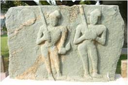 | Description / विवरण | A memorial slab representing two male figures standing each holding a long sword in his right hand. The object held in the left hand of the person standing at the right side is not clear. The figures wear large ear ornaments. |