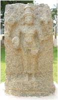 | Description / विवरण | Fragment of a wall panel depicting lord Venkatesha, holding the front right hand in Varada pose. The back right and left hands hold the discus and the conch respectively. The front left hand is in keti pose. The God wears a long cylindrical crown. |