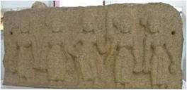 | Description / विवरण | A memorial stone depicting the hero standing flanked on either side by two female figures. The hero is holding a pointed dagger like object in his left hand. In the right hand is possibly a sword which is kept with the point downwards ear the right foot. |