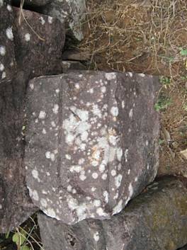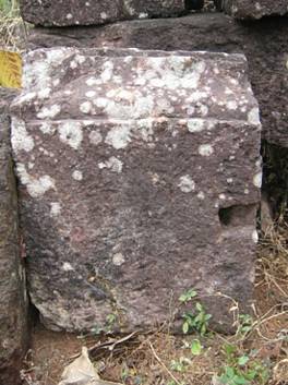 | Description / विवरण | The stone slab is almost rectangular in shape. One edge is modified by creating a slope design along with two grooved lines on both sides. One groove for the iron dowel is visible on the upper surface. One tanku is visible on the modified edge. |