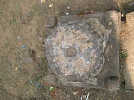| Description / विवरण | The base of a pillar is made up in two steps like projection.The lower one is square having tankus on four corners.The upper part is tapered with octagonal fashion.One hole is visible on the top. |