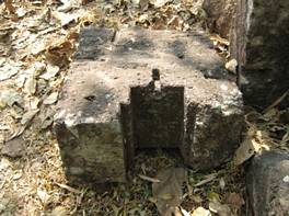 | Description / विवरण | The stone slab has a long groove on its outer side end.The groove is flanked by two vertical mouldings. On the upper surface four holds, to hold iron dowels, are visible. It is part of a salilantara on the temple wall. |