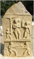 | Description / विवरण | A memorial slab depicting two warriors engaged in a fight each holding swords in both their hands. Behind the man at the right is a tiny human figure holding in his right hand a sharp dagger which is resting on his right shoulder and a big round shield. |