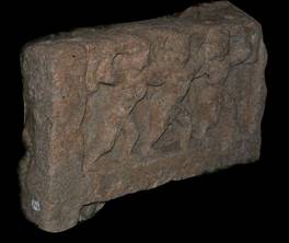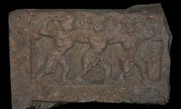 | Description / विवरण | This fragment is part of a herostone depicting the hero being carried to heaven after his demise, by two female celestials, a feature usually encountered in such herostones.The relief depicts the male figure at the centre resting his hands on the soulders of female figures shown on either side who in turn are holding him from the back in their right and left hand respectively whereas other raised hand rests on their head. As the surface is wornout due to weathering, details of ornaments and other facial features are not discernible except the outline of lower garment with frills suspended down between the legs.The posture of legs and flowing of garment indicate they are airborne.Relief may be ascribed to early chalukyan period on stylistic grounds. |