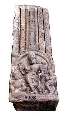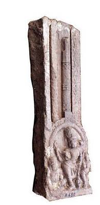 | Description / विवरण | Vertical pillar of door jamb of pancha sakha variety with standing dwarapalaka at the foot holding mace, flanked by attendants. It is decorated with flutings and foliage designs. |