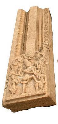| Description / विवरण | Door jamb decorated with foliage motifs and fluting marks. Lower part represents Saivite Dwarapalaka standing with the right leg raised and kept on the mace. Flanked by male and female attendants. Dwarapala holds trident and damaru in his left hands while the right hold serpent and the other kept in lola hasta posture. The whole panel is encircled by curved prabhavali with on the top. |