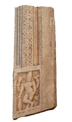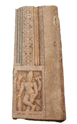 | Description / विवरण | Vertical pillar of a door jamb showing saivite dwarapala at the foot standing cross legged. The two rear hands hold trident and damaru. The right front hand rests on the mace, where as the left hand rests on the hip in katyavalambita posture. It is also decorated with fluting and foliage design. |