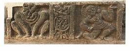 | Description / विवरण | An architrave divided into three niches. The first one shows a zoomorphic figure of a lion faced human being, probably Narasimha in semi seated posture with the hands firmly placed on the ground and the legs half raised and kept wide apart. In between 1st and 2nd niches is a creeper like design with foliage motif. The second niche depicts a male performing dance, with the right leg turned backwards and the toe raised and the knee kept on the ground while the left leg is firmly planted. He is decorated with waist-band with kanthamala in three strands and hara. |