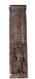 | Description / विवरण | A dwarapalika image Yamuna standing on the tortoise in the bottom of the door jamb. Her hair is done into jatas falling on either side. She holds a lotus bud in her right hand while the left hand hangs down freely holding water vessel. She wears a tight necklace and flowing hara in between the breasts. She wears a long ardhoruka with central tassel in the middle. |