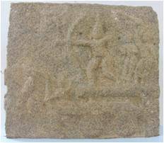 | Description / विवरण | An indeterminate stone slab, possibly an architectural fragment depicting a royal warrior charging his bow from his chariat driven by a horse. The figure possibly represents Arjuna as indicated in Mahabharata battle, Lord Krishna depicted as a charitor. |