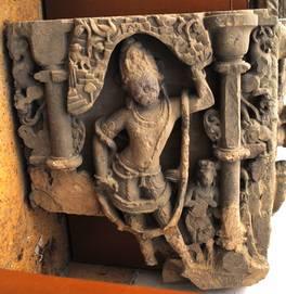 | Description / विवरण | The sculpture of Krishna in between two pilasters is displayed uplifting the mountain Govardhana. On the top of the hill the different flora and fauna are depicted. Krishna is shown in katihasta-mudra. He wears the kirita-mukuta,necklace, kundala, katimekhala, kativastra, vaijayantimala, keyura and valaya. On the peetha one side of Krishna a figure of a divotee is shown in dvibhanga posture. |