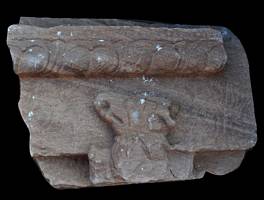 | Description / विवरण | This is part of a veneering member used for decorating the wall of a temple of early-chalukyan period.The top portion contains a offset decorated with upturned lotus petals carrying a frame having a row of bead design. At the bottom, part of a pouncing mythical griffin with eagle like beak, a fang protruding from the jaw is depicted.It has protruded eye ball and above the eye a short horn turning slightly backward is shown.Neck portion depicts rows of lion mane and the right paw drawn close to chest is shown. |