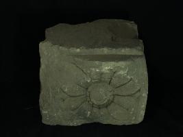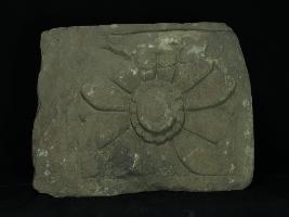 it is a fragment of Architectural member made of sand stone having a lotus flower design.