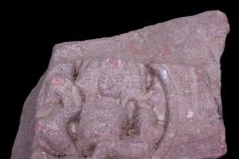 It is a pillar fragment with the human image on it. Its details are not very clear. All sides are broken. Eyes and other ornaments are visible. Its base is remaining.