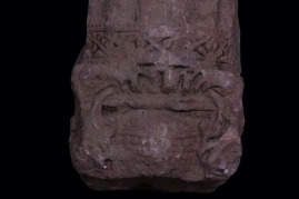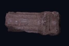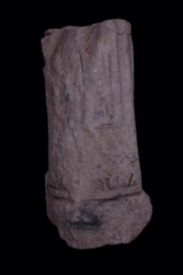 A pillar with a band of criss cross lines on its base, besides geometrical motifs can also be see, white substance has formed on the surface. Its upper part is broken and right side is damaged