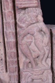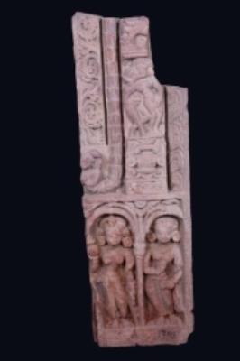 It is a pillar having foliage motifs on border, upper part consists of a male and female figure together, lower part has two female figures holding tree branches, it most probably represents fertility cult.