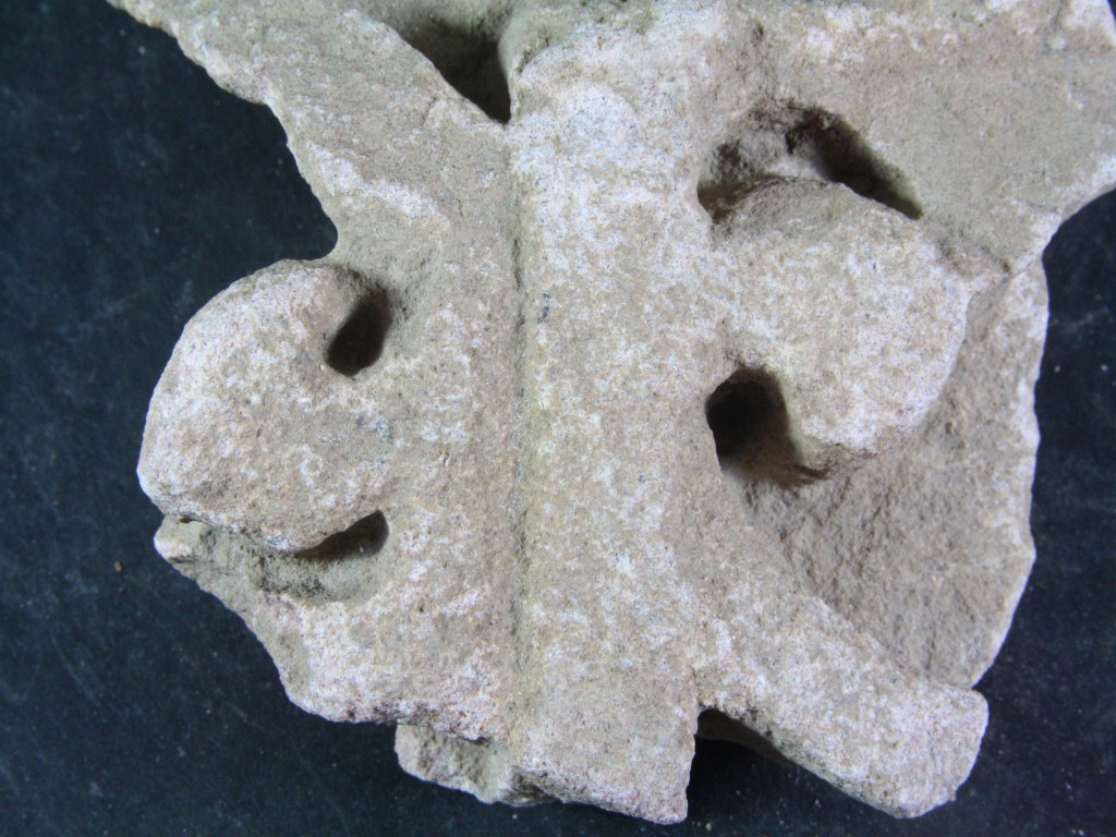 It s a Fragment of Architectural member made of stone, Colour is brownish. It is well decorated and design is clearly visible. All sides are broken. Deposition of dust and dirt. Rubbing on the surface and flaking on it.