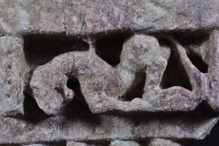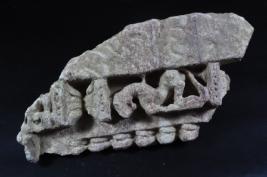 It s a Fragment of Architectural member . It is damaged from all sides and its colour is brownish. It is well decorated floral design and camel miniature sculpture on it. Incise lines design on it. Its bottom portion is flat. Many irregular marks on the surface. Rubbing on the surface and deposition of dust. Surface is rough and flaking on it.