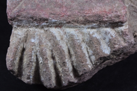 It s a Fragment of Architectural member. It is damaged from all sides and its colour is brownish. It is well decorated and deep design on it. Incise lines design on it. Its bottom portion is flat. Rubbing on the surface and deposition of dust. Surface is rough and flaking on it.