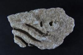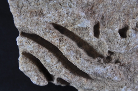 It s a Fragment of Architectural member made of stone. It is damaged from all sides and its colour is brownish. It is deep design on it. Its upper and bottom position is lost. Rubbing on the surface and many irregular marks on it.