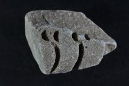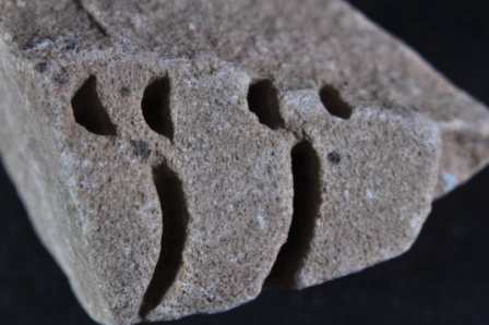 It s a Fragment of Architectural member made of stone. It is damaged from all sides and its colour is brownish. It is well decorated and deep design on it. Its upper and bottom position is lost. Rubbing on the surface and many irregular marks on it.