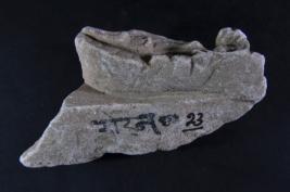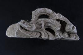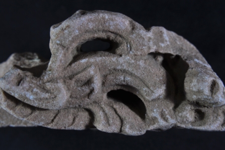 It s a Fragment of Architectural member made of stone. It is damaged from all sides and its colour is brownish. It is well decorated and leaf design on it. Its upper and bottom position is lost. Rubbing on the surface and many irregular marks on it.
