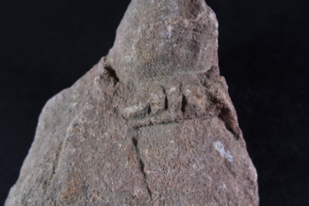 It s a Fragment of Architectural member made of stone. It is damaged from all sides and its colour is brownish. It is well decorated and dotted design on it. Its upper and bottom position is lost. Rubbing on the surface and many irregular marks on it.