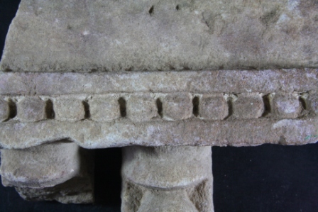 It s a Fragment of Architectural member made of stone. It is damaged from all sides and its colour is brownish. It is well decorated and dotted design on it. Its upper and bottom portion Lost. Rubbing on the surface and many irregular marks on it.