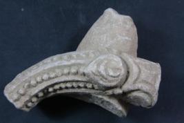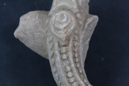 It s a fragment of pillar and made of red sand stone. All sides are mutilated but decorated design are visible. Fore part is some raised. Scratching overall.