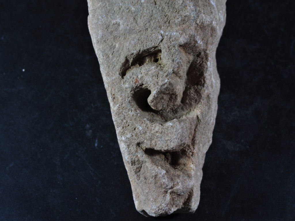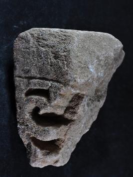 It s a Fragment of pillar made of sand stone and colour is brownish. It s incise design and deep design on it. It s bottom portion is flat and all sides are broken. Many scratch and rubbing on the surface.
