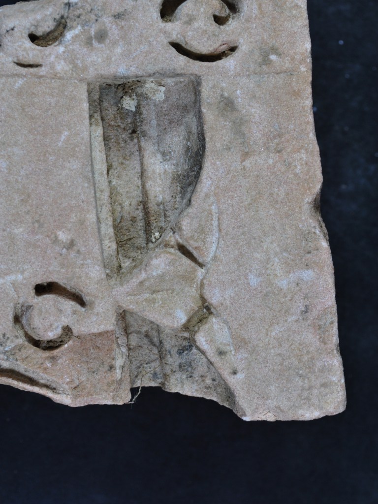It s a Fragment of Architectural member made of sand stone and colour is brownish. It s deep design, leaves design and a lotus leaf design on itt. It s all sides are broken and bottom portion is flat. Many scratch and rubbing on the surface.