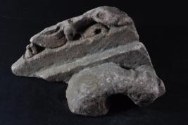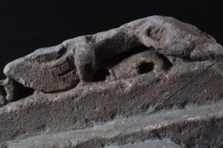 Architectural member decorated with floral and steep line design.