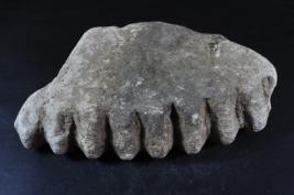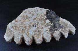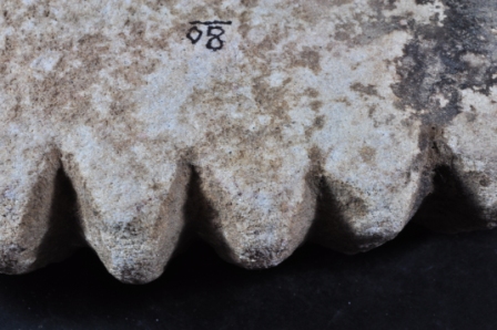 It s a stone sculpture. It is damaged from all sides and its colour is brownish. It is well decorated and deep design on it. Incise lines design on it. Its bottom portion is flat. Many irregular marks on the surface. Rubbing on the surface and deposition of dust. Surface is rough and flaking on it.