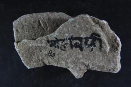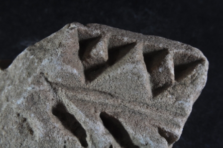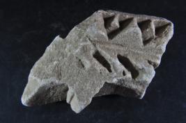 Architectural member made of stone, Color is brownish. All sides are broken and leaves design on it. Deposition of dust and dirt. Rubbing on the surface and flaking on it.