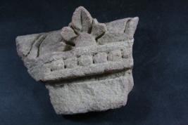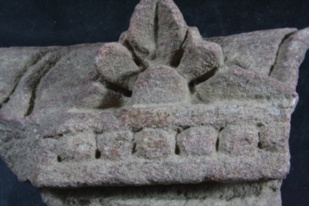 Fragment of lintel made of stone, Color is brownish. A lotus design, chain like design, on it and all sides are broken. Deposition of dust and dirt. Rubbing on the surface and flaking on it.